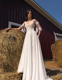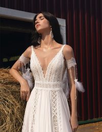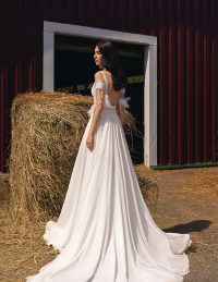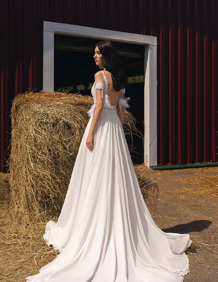 This stunning princess-line wedding dress blends romance with modern elegance. The structured bodice with exposed boning and delicate lace beautifully enhances the silhouette, while the detachable shoulder chains add a touch of contemporary charm. The soft tulle skirt with subtle sparkle and a long train creates a dreamy, fairytale bridal look. A wedding gown that combines femininity and bold style—perfect for the bride who wants to make a statement with grace and sophistication on her special day.