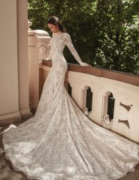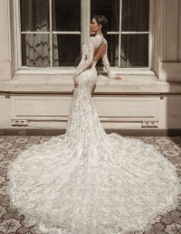 This dreamy A-line wedding dress exudes romance and subtle luxury. The bodice is hand-embroidered with pearls and crystals, adding a touch of sparkle and elegance. The illusion neckline creates an ethereal, lightweight feel, perfectly complementing the soft tulle skirt that flows with grace and movement. A perfect bridal gown for the bride who envisions an elegant and romantic look on her special day. This wedding dress beautifully combines timeless charm with delicate, modern details.