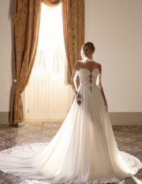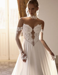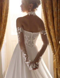 Αυτό το ονειρικό νυφικό σε Α-γραμμή αποπνέει ρομαντισμό και κομψότητα. Το βαθύ V ντεκολτέ με διαφάνεια συνδυάζεται αρμονικά με τα φουσκωτά μανίκια, προσφέροντας μια ρομαντική, vintage αίσθηση. Η φούστα είναι στολισμένη με τρισδιάστατα λουλούδια και παγιέτες που χαρίζουν κίνηση και λάμψη σε κάθε βήμα. Ένα ιδιαίτερο νυφικό φόρεμα για τη νύφη που επιθυμεί να ζήσει τον δικό της παραμυθένιο γάμο με ρομαντική πολυτέλεια και φίνα αισθητική.