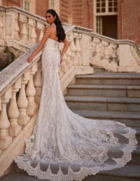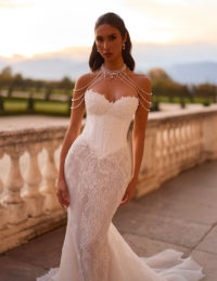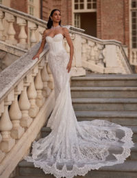 Αυτό το εκθαμβωτικό νυφικό σε γραμμή γοργόνας είναι σχεδιασμένο για τη σύγχρονη νύφη που λατρεύει τη λάμψη και την κομψότητα. Δημιουργημένο από ύφασμα κεντημένο με λαμπερές χάντρες, αγκαλιάζει το σώμα αναδεικνύοντας κάθε καμπύλη. Το μπούστο με sweetheart λαιμόκοψη και λεπτές τιράντες προσδίδει ρομαντισμό και θηλυκότητα, ενώ η ανοιχτή πλάτη χαρίζει μια δόση αισθησιασμού. Τα αποσπώμενα τούλινα μανίκια προσθέτουν δραματικότητα, δημιουργώντας μια αέρινη κίνηση. Ιδανικό για μια νύφη που θέλει να λάμπει και να εντυπωσιάζει!
