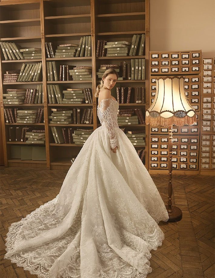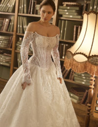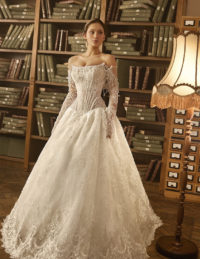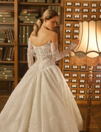 Το νυφικό Amy εντυπωσιάζει με τον κορσέ σε ίσια γραμμή και την πλούσια φούστα από δαντέλα, που δημιουργούν ένα αρμονικό και ανάλαφρο σύνολο. Οι λεπτομέρειες από κεντημένη δαντέλα προσθέτουν λάμψη και ρομαντισμό, ενώ το εντυπωσιακό δαντελένιο κάπα που πέφτει από τους ώμους χαρίζει μια μοναδική, βασιλική αύρα.