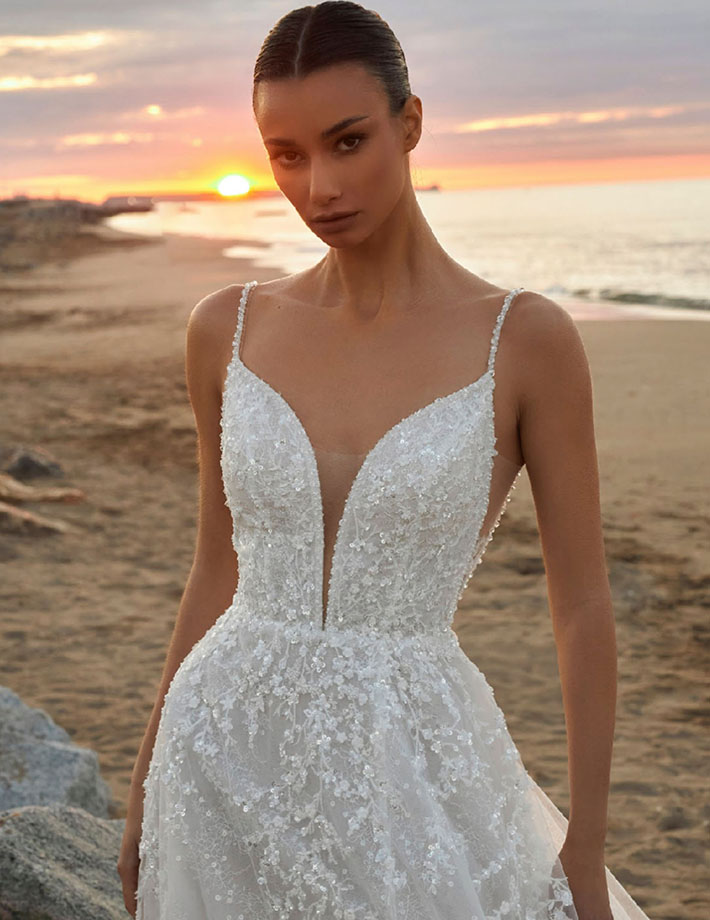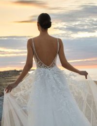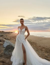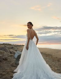 Νυφικό με ντεκολτέ σε σχήμα καρδιάς με φαρδιά τιράντα και μπούστο από δαντέλα broderi και μουσελίνα με τρουακάρ μανίκια. Φούστα σε αέρινη γραμμή από μουσελίνα μεταξωτή με άνοιγμα στο πλάι. Το νυφικό έχει μικρή ουρά.