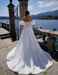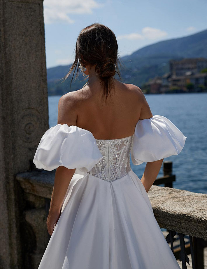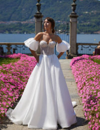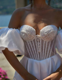Το νυφικό Bridget μαγνητίζει με τον κορσέ σε σχήμα καρδιάς, διακοσμημένο με λαμπερές πούλιες, κεντητές λεπτομέρειες και διάφανες ραφές που αναδεικνύουν το μπούστο με εκλεπτυσμένο τρόπο.Τα αποσπώμενα balloon μανίκια προσθέτουν μια ρομαντική, αιθέρια πινελιά, ενώ η σατινέ φούστα αγκαλιάζει απαλά τη σιλουέτα, δημιουργώντας μια αίσθηση πολυτέλειας και αρμονίας.Ένα νυφικό που συνδυάζει τη θηλυκότητα, τη λάμψη και την εκλεπτυσμένη φινέτσα — ιδανικό για μια νύφη που θέλει να λάμψει με στυλ και χάρη.