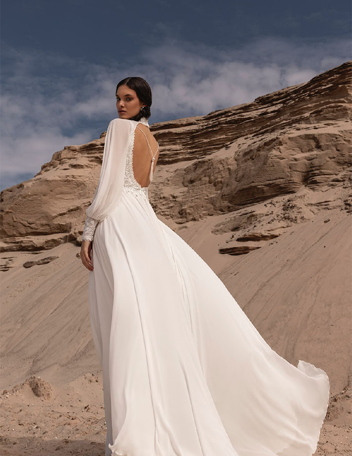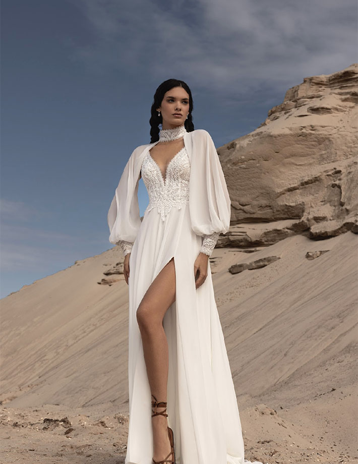 Ιδιαίτερα θηλυκό νυφικό με ντεκολτέ σε σχήμα καρδιάς. Το περίτεχνο σχέδιό του είναι φτιαγμένο από δαντέλα Chantilly, broderi δαντέλα και πολύτιμο τούλι. Αποσπώμενο bolero από τούλι και απλικέ δαντέλα με μακριά μανίκια. Η φούστα αυτού του υπέροχου νυφικού με το μαλακό τούλι και το άνοιγμα στο πλάι προσθέτει μια έξτρα πινελιά κομψότητας, μετατρέποντάς το σε ένα μοναδικό κόσμημα.