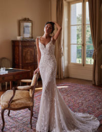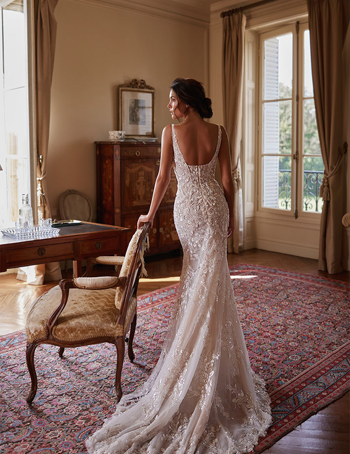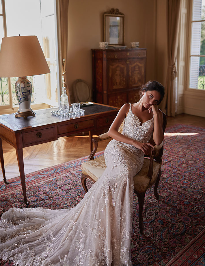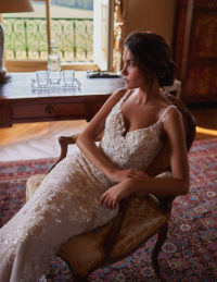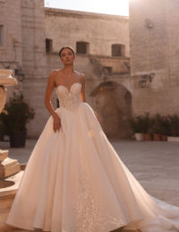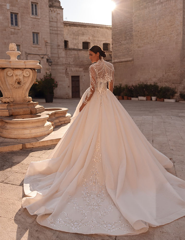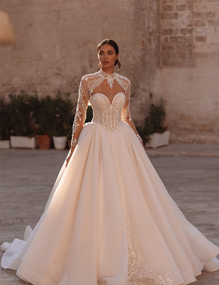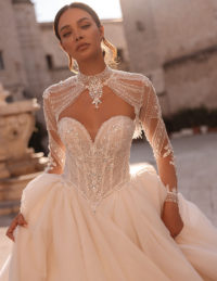Το νυφικό Christa είναι ένα αριστούργημα λάμψης και ρομαντισμού, σχεδιασμένο για τη νύφη που θέλει να εντυπωσιάσει με κομψότητα και φινέτσα.Το strapless μπούστο με πλούσιο κέντημα από πέρλες, κρυστάλλους και παγιέτες αγκαλιάζει αρμονικά το σώμα, δημιουργώντας μια εκθαμβωτική λάμψη.Το αποσπώμενο bolero από διαφανές τούλι, με μακριά μανίκια και ψηλό κολάρο, είναι στολισμένο με περίτεχνες κεντημένες λεπτομέρειες που προσθέτουν αέρα βασιλικής πολυτέλειας.Η πλούσια τούλινη φούστα ολοκληρώνει το look με ρομαντισμό και ανάλαφρη κίνηση.