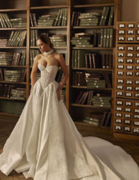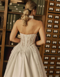 Αυτό το εντυπωσιακό νυφικό συνδυάζει την απόλυτη κομψότητα με μια δόση τολμηρού στυλ. Το ημιδιαφανές μπούστο με ψηλό λαιμό και μακριά μανίκια είναι στολισμένο με περίτεχνη δαντέλα και απλικέ λεπτομέρειες. Η αέρινη φούστα από τούλι με δύο βαθιά ανοίγματα στα πόδια χαρίζει κίνηση και δυναμισμό. Ένα bridal gown που ισορροπεί ανάμεσα στη διαχρονική φινέτσα και τη μοντέρνα αισθητική — ιδανικό για τη νύφη που θέλει να μαγνητίσει όλα τα βλέμματα.