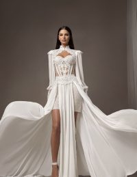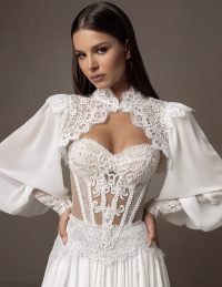 Αυτό το εκλεπτυσμένο νυφικό εντυπωσιάζει με τη ρομαντική του αισθητική και τις luxurious λεπτομέρειες. Το strapless μπούστο με βαθύ ντεκολτέ είναι διακοσμημένο με ανάγλυφη δαντέλα και τρισδιάστατα λουλούδια, ενώ η διαφάνεια στο corset προσφέρει μοντέρνο bridal χαρακτήρα. Η φούστα από τούλι με πουά glitter προσθέτει λάμψη και ανάλαφρη κίνηση. Ένα νυφικό ιδανικό για τη νύφη που αναζητά κομψότητα, φινέτσα και παραμυθένια ατμόσφαιρα την ημέρα του γάμου της.