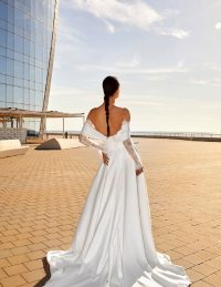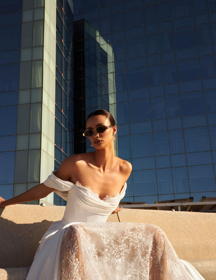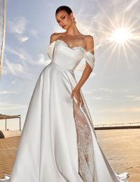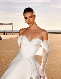 Ένα ρομαντικό και αέρινο νυφικό που συνδυάζει φινέτσα και λάμψη. Ο κορσές χωρίς τιράντες αγκαλιάζει το σώμα, αναδεικνύοντας τη σιλουέτα, ενώ τα αποσπώμενα μανίκια χαρίζουν μια παραμυθένια αίσθηση. Η φούστα από τούλι με γκλίτερ δημιουργεί μια μαγική λάμψη σε κάθε κίνηση. Η ελαφριά και κομψή γραμμή του το καθιστά ιδανική επιλογή για τη νύφη που θέλει να νιώθει άνετη και λαμπερή. Ένα διαχρονικό νυφικό που αποπνέει ρομαντισμό και θηλυκότητα.