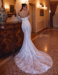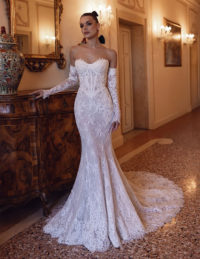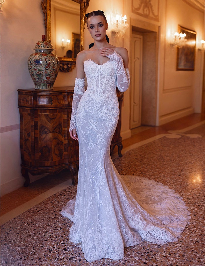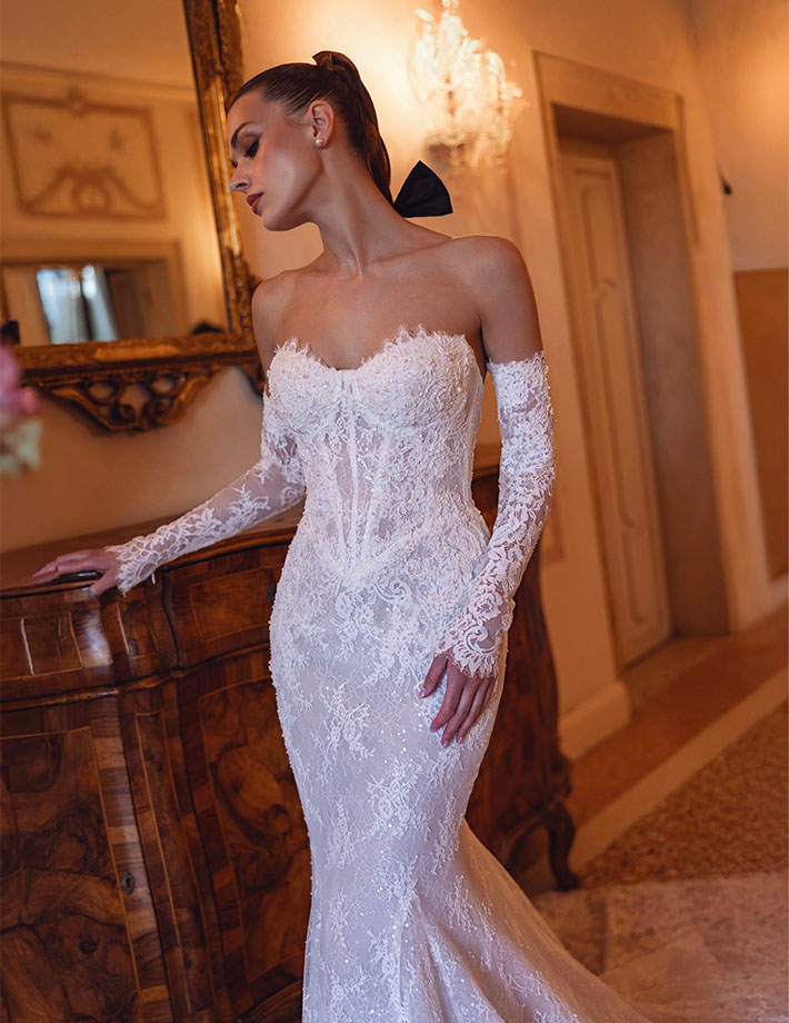 Αυτό το εκθαμβωτικό νυφικό σε γραμμή γοργόνας αναδεικνύει τη θηλυκότητα με το εφαρμοστό κόψιμό του. Το μπούστο χαμόγελο προσφέρει ρομαντική και αισθησιακή διάθεση, ενώ ο κορσές με boning προσφέρει στήριξη και τέλεια εφαρμογή. Η δαντέλα με παγιέτες και το γκλίτερ τούλι χαρίζουν εκτυφλωτική λάμψη, ενώ οι τρισδιάστατες λεπτομέρειες από πέρλες και κεντημένα λουλούδια προσθέτουν κομψότητα. Τα αποσπώμενα μανίκια ολοκληρώνουν το look, δημιουργώντας ένα νυφικό μοναδικής αισθητικής για τη νύφη που θέλει να ξεχωρίσει.