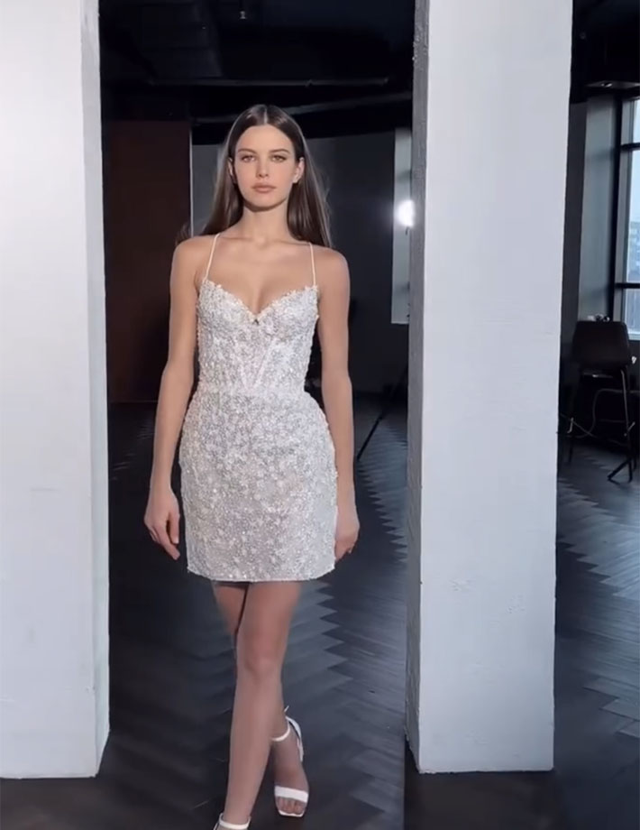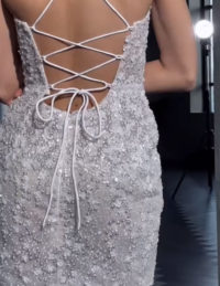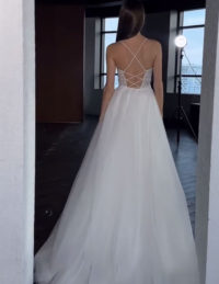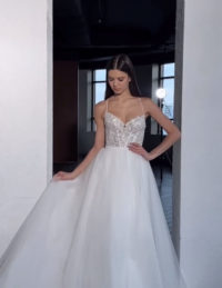 Αυτό το εντυπωσιακό νυφικό σε γραμμή γοργόνα αποπνέει κομψότητα και διαχρονική θηλυκότητα. Το strapless μπούστο με διαφάνεια και βαθύ ντεκολτέ αγκαλιάζει το σώμα, ενώ η πλούσια δαντέλα και τα απλικέ κεντήματα προσθέτουν ρομαντική πολυτέλεια. Η εφαρμοστή σιλουέτα ανοίγει αρμονικά στο κάτω μέρος, καταλήγοντας σε εντυπωσιακή ουρά με λεπτομέρειες από τούλι και δαντέλα. Ένα νυφικό ιδανικό για τη νύφη που θέλει να ξεχωρίσει με ένα αισθησιακό, elegant και απολύτως bridal look.