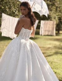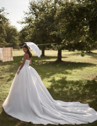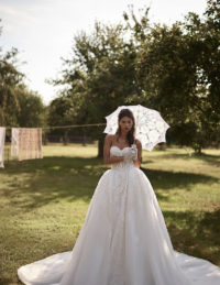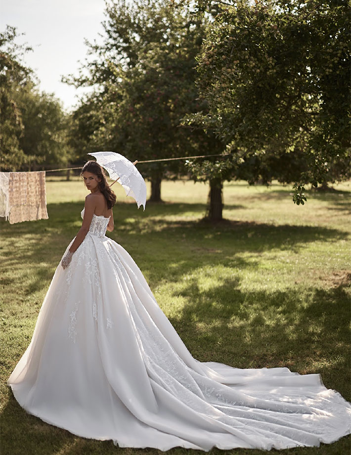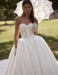 Αυτό το εντυπωσιακό νυφικό σε γραμμή princess συνδυάζει ρομαντισμό και σύγχρονη κομψότητα. Το structured μπούστο με ορατές μπανέλες και δαντέλα τονίζει υπέροχα τη σιλουέτα, ενώ οι λεπτεπίλεπτες αποσπώμενες αλυσίδες στους ώμους προσθέτουν μοντέρνα γοητεία. Η φούστα από απαλό τούλι με διακριτική λάμψη και μακριά ουρά δημιουργεί μια αέρινη, παραμυθένια bridal εικόνα. Ένα νυφικό που συνδυάζει δυναμισμό και ρομαντισμό, ιδανικό για τη νύφη που θέλει να ξεχωρίσει με στυλ και φινέτσα.