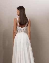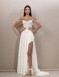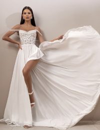 Ένα ρομαντικό νυφικό με off-the-shoulder σχέδιο που αναδεικνύει τη θηλυκότητα. Ο κορσές αγκαλιάζει τη μέση, ενώ η αέρινη φούστα σε γραμμή Α χαρίζει κίνηση και κομψότητα. Τα απαλά μανίκια και το διακριτικά λαμπερό ύφασμα δημιουργούν μια ονειρική αίσθηση. Η ουρά προσθέτει επιβλητικότητα, ενώ το δέσιμο στην πλάτη εξασφαλίζει τέλεια εφαρμογή. Ιδανική επιλογή για μια νύφη που θέλει να συνδυάσει τη διαχρονική κομψότητα με ένα μοντέρνο, ρομαντικό ύφος.