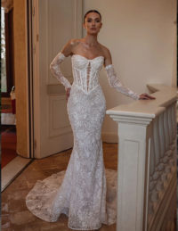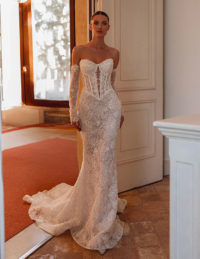 Αυτό το εντυπωσιακό νυφικό συνδυάζει ρομαντισμό και διαχρονική φινέτσα. Το structured μπούστο τύπου κορσέ με off-shoulder κόψιμο είναι στολισμένο με λαμπερή δαντέλα και παγιέτες, αναδεικνύοντας μοναδικά το ντεκολτέ. Η φούστα σε Α-γραμμή από δαντέλα προσφέρει κομψή γραμμή, ενώ η αποσπώμενη φούστα από μαλακό τούλι προσθέτει αέρινο όγκο και δραματικότητα. Ιδανικό νυφικό φόρεμα για τη νύφη που θέλει να εντυπωσιάσει με πολυτέλεια και αρχοντική παρουσία.