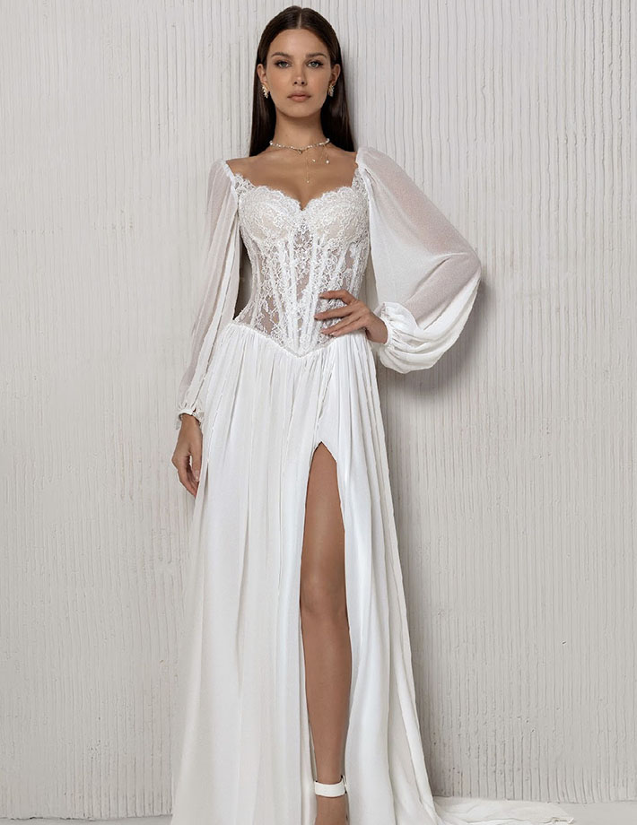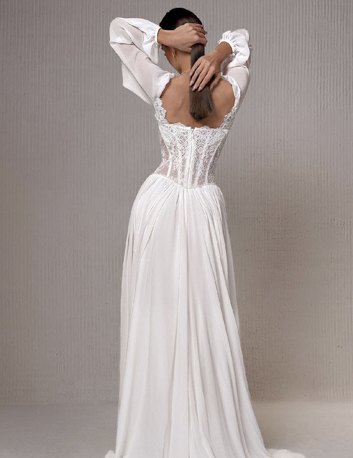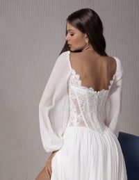Αυτό το αισθησιακό και κομψό νυφικό φόρεμα αγκαλιάζει τη σιλουέτα με απόλυτη φινέτσα. Είναι φτιαγμένο από εντυπωσιακή δαντέλα με διάφανα στοιχεία και ανάγλυφα μοτίβα, ενώ η ανοιχτή πλάτη και τα μακριά μανίκια το κάνουν ιδανικό για μια νύφη με μοντέρνο και τολμηρό στυλ. Η εφαρμοστή γραμμή και η διακριτική ουρά ολοκληρώνουν το look.