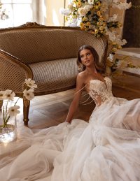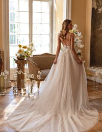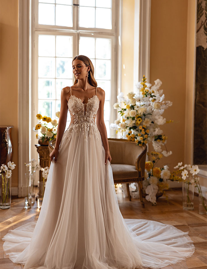 Ξεχωριστό νυφικό σε Α γραμμή από τούλι και δαντέλα με απλικέ λουλούδια. Μπούστο σε σχήμα V με δαντέλα, τούλι illusion και απλικέ λουλούδια. Εντυπωσιακή πλάτη σε σχήμα V. Φούστα από τούλι γκλίτερ.