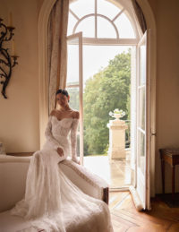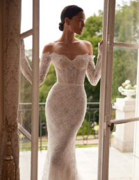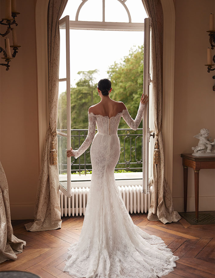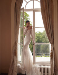 Αυτό το νυφικό φόρεμα είναι μια απόλυτη έκφραση ρομαντισμού και κομψότητας. Με δαντέλα υψηλής ραπτικής και διαφάνειες που αγκαλιάζουν το σώμα, δημιουργεί μια αίσθηση αέρινης πολυτέλειας. Τα μακριά μανίκια με κεντημένες λεπτομέρειες προσδίδουν βασιλική φινέτσα, ενώ η ψηλή λαιμόκοψη χαρίζει αρχοντιά. Η εντυπωσιακή αποσπώμενη ουρά από τούλι και τα ασύμμετρα layers δίνουν όγκο και κίνηση. Ιδανικό για τη νύφη που αναζητά ένα μοναδικό, ρομαντικό νυφικό με διαχρονικό χαρακτήρα και εντυπωσιακή πλάτη.