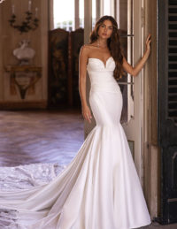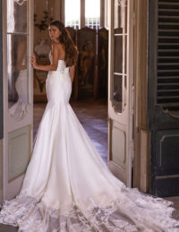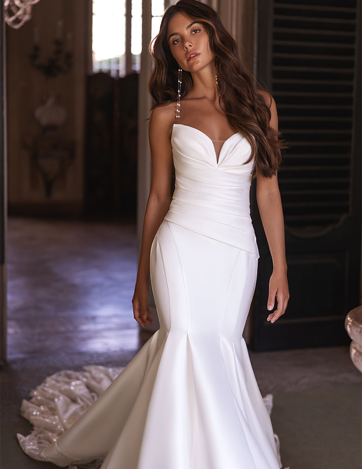 Αυτό το κομψό νυφικό φόρεμα διαθέτει ρομαντικό ντεκολτέ off-the-shoulder και στράπλες μπούστο διακοσμημένο με λαμπερές λουλουδένιες απλικέ λεπτομέρειες και παγιέτες. Η εφαρμοστή γραμμή αγκαλιάζει αρμονικά τη σιλουέτα και καταλήγει σε εντυπωσιακή τούλινη ουρά, προσφέροντας μια μαγευτική bridal εμφάνιση. Τα απαλά διαφανή μανίκια από τούλι με ντραπέ ύφος χαρίζουν αέρινη φινέτσα. Ένα ιδανικό νυφικό για τη σύγχρονη νύφη που επιθυμεί έναν συνδυασμό ρομαντισμού, λάμψης και διαχρονικής κομψότητας.
