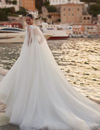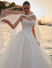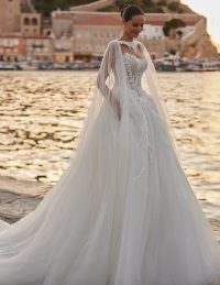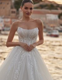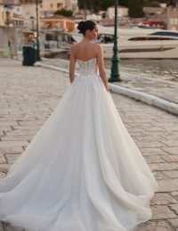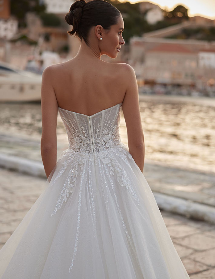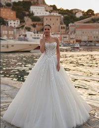 Αυτό το νυφικό σε γραμμή Α συνδυάζει την κομψότητα με την αίσθηση ελευθερίας, ιδανικό για νησιώτικο ή καλοκαιρινό γάμο. Το structured μπούστο με λεπτές τιράντες και ντεκολτέ σε σχήμα καρδιάς αναδεικνύει τη σιλουέτα, ενώ το glitter πουά ύφασμα χαρίζει διακριτική λάμψη. Η αέρινη φούστα με εντυπωσιακό άνοιγμα στο πόδι προσφέρει ανάλαφρη κίνηση και θηλυκότητα. Ένα bridal gown που αποπνέει φρεσκάδα, ρομαντισμό και ανεπιτήδευτη πολυτέλεια – ιδανικό για τη μοντέρνα νύφη.
