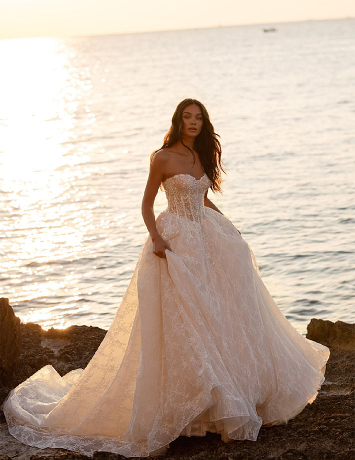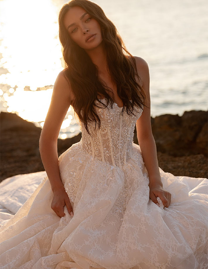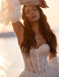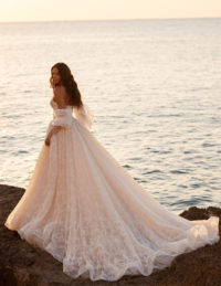 Το νυφικό Pearl είναι η επιτομή της αιθέριας κομψότητας και του ρομαντισμού. Με κορσέ από δαντέλα που αγκαλιάζει απαλά τη σιλουέτα και αποσπώμενα τούλινα μανίκια που προσθέτουν μια αέρινη, παραμυθένια νότα, το νυφικό αυτό εκπέμπει διακριτική πολυτέλεια. Η πλούσια φούστα από δαντέλα, με ανάλαφρη κίνηση και διακριτική λάμψη, δημιουργεί μια μαγευτική εικόνα σε κάθε βήμα, ενώ η ουρά ολοκληρώνει το look με εντυπωσιακή φινέτσα.