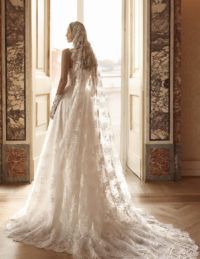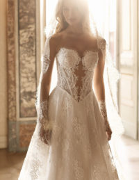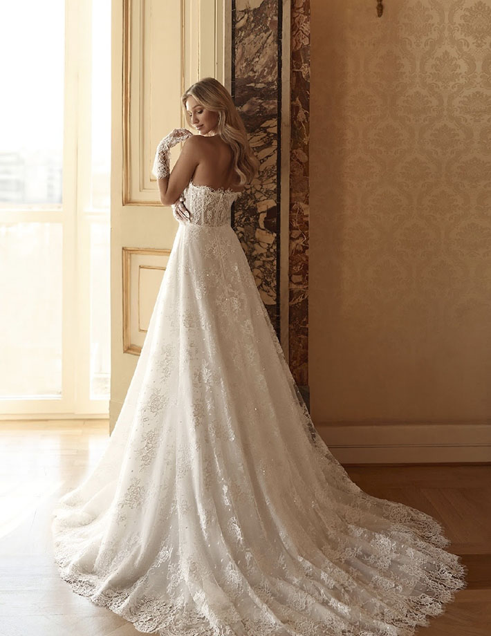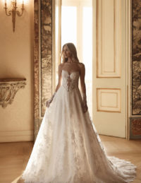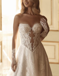 Αυτό το κομψό νυφικό φόρεμα αποπνέει διαχρονική φινέτσα με το structured μπούστο τύπου κορσέ, διακοσμημένο με διακριτικές πέρλες που προσθέτουν πολυτέλεια. Η φούστα σε Α-line γραμμή είναι φτιαγμένη από φίνα μεταξωτή οργάντζα, χαρίζοντας ανάλαφρη κίνηση και ρομαντική αίσθηση. Η ντραπέ λεπτομέρεια στη μέση και η εντυπωσιακή ουρά ολοκληρώνουν το look με χάρη και στυλ.